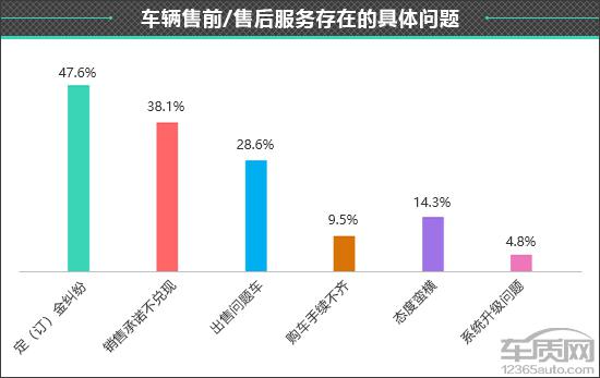 進(jìn)一步調(diào)查表明,車主抱怨集中在銷售問(wèn)題上,部分車主認(rèn)為存在“定(訂)金糾紛”和“銷售承諾不兌現(xiàn)”等問(wèn)題。