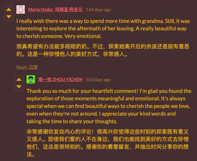 周一忱的人生并非一帆風(fēng)順。畢業(yè)回國后,他很長時間沒有長輩眼中穩(wěn)定的工作,現(xiàn)在和女朋友經(jīng)營藝術(shù)設(shè)計工作室,屬于自由職業(yè)。他打算申請博士,研究嚴(yán)肅游戲和新媒體藝術(shù)等。32歲的他,壓力時常浮現(xiàn)。在《奶奶》中,操縱角色走到衛(wèi)生間鏡子前,會看到周一忱面無表情的臉和去年留下的字:你已經(jīng)31歲,卻一事無成。