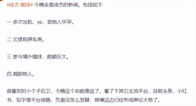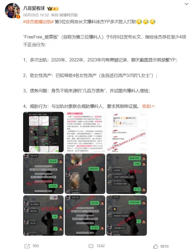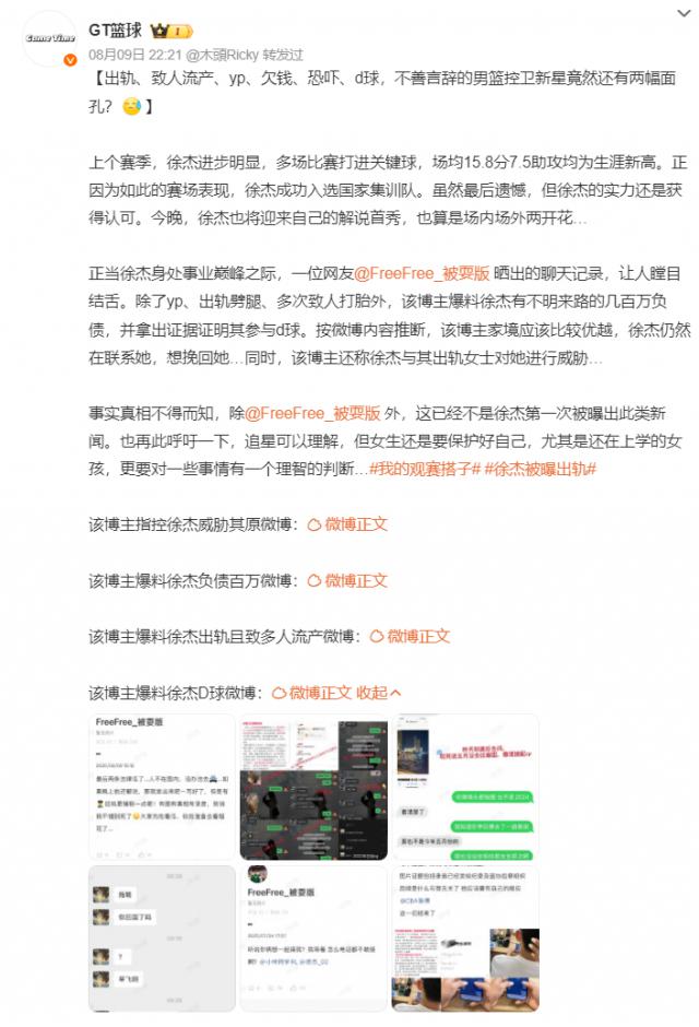徐杰身陷多項(xiàng)負(fù)面?zhèn)髀?,博主疑似扒出假球場?/h1> 08-11 06:30 北京時(shí)間8月9日,社媒名為FreeFree_被耍版(自稱第三位爆料人)的用戶發(fā)長文指控CBA廣東男籃球員徐杰存在多項(xiàng)不正當(dāng)行為,如出軌、賭球、致人懷孕流產(chǎn)、欠下巨額債務(wù)等。不過需要注意的是,這只是當(dāng)事人爆料,并沒有實(shí)錘,大家理性吃瓜。