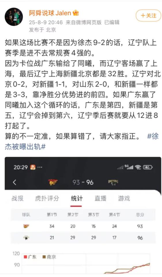 還有博主疑似扒出徐杰參與賭球/假球的場次。在廣東93 - 96不敵同曦的這場卡位戰(zhàn)中,徐杰9投2中。如果廣東不是輸給同曦,遼寧就無法進(jìn)入四強(qiáng)。若廣東擊敗同曦,廣東會是第四,新疆是第五,遼寧會掉到第六,就要去打12進(jìn)8的比賽,所以該博主認(rèn)為這場比賽徐杰有很大嫌疑。