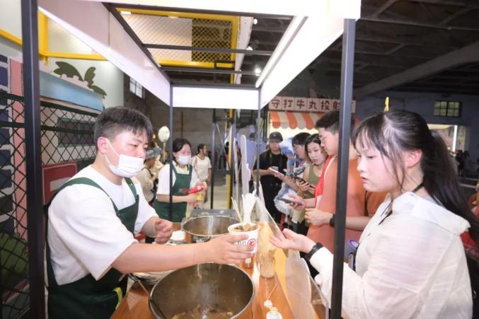 此次RED LAND展位以“工業(yè)風(fēng)×廣式大排檔”為設(shè)計(jì)靈感,將韶關(guān)老巷的煙火氣與復(fù)興島工業(yè)遺存相結(jié)合。游客不僅能品嘗到原汁原味的蘿卜牛雜、牛腩煲等經(jīng)典菜品,還能參與“牛雜DIY工作坊”,在廚藝NPC指導(dǎo)下調(diào)配專屬醬料,解鎖“痛碗”(定制痛文化主題餐具)獎勵。
