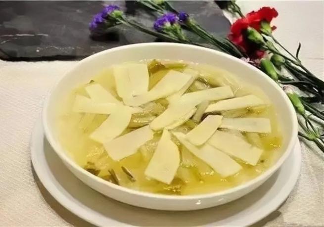 筍片腌白菜湯:腌下的白菜在壇中完成風(fēng)味轉(zhuǎn)化,酸香清爽,筍切片留住最后的脆嫩。清水共煮,酸香喚醒味蕾,筍鮮調(diào)和酸度。無需葷腥,這碗湯清亮透徹,酸鮮開胃,是夏日驅(qū)散暑氣的靈丹妙藥,是蕭山人化平凡為至味的生存智慧。