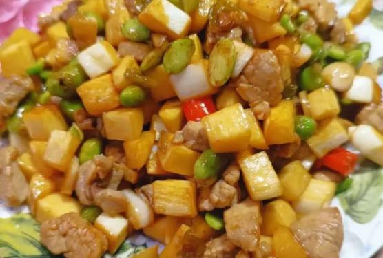 茭白炒三?。核忻廊塑浊卸?,與切成丁的香干、肉?。ɑ蚬S丁、毛豆)同炒。茭白的清甜爽脆是基礎(chǔ),香干的豆香與嚼勁是骨架,肉丁的脂香或毛豆的鮮甜是點(diǎn)綴。一勺入口,口感豐富,層次分明,咸鮮適口,是蕭山人家餐桌上的小清新。