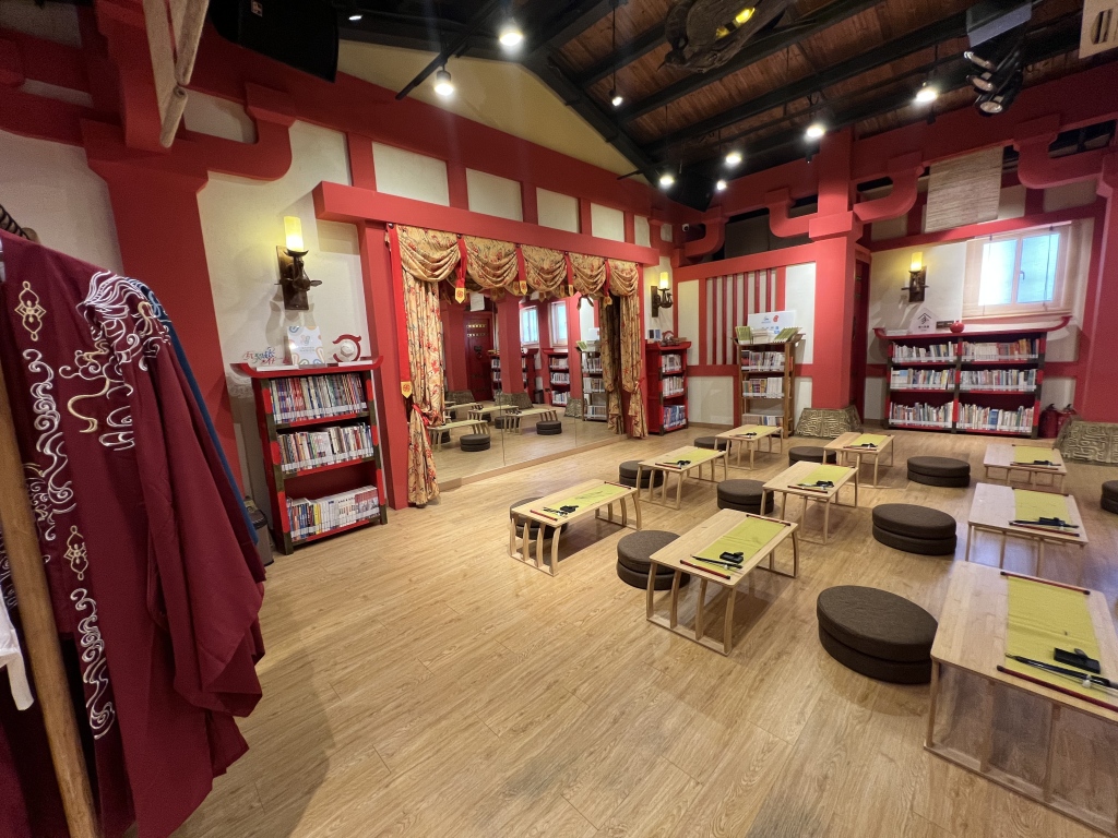 相鄰的東殿則是另一片閱讀天地:靠墻的三層紅色矮書架上擺滿了傳統(tǒng)文化書籍和繪本,小朋友們可以坐在矮桌前席地閱讀。整面玻璃讓空間更加通透,搬走桌椅后,這里還能變成舞蹈房,供社區(qū)舞蹈隊排練。漢服衣架上掛滿了各式傳統(tǒng)服飾,隨時為沉浸式體驗活動做好準備。