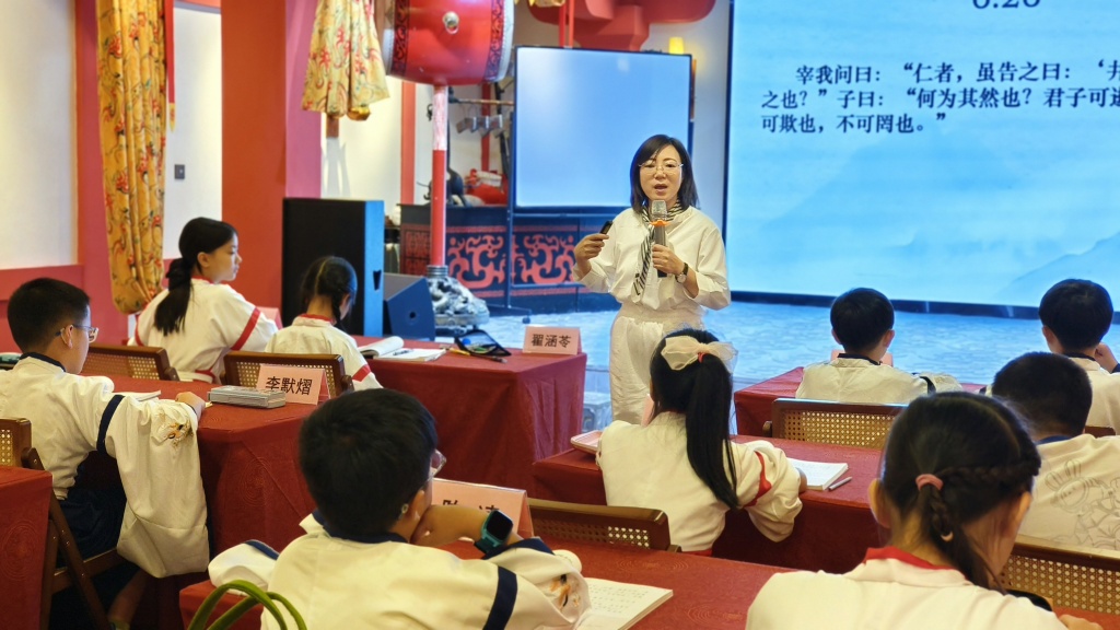 論語啟蒙進階課上,孩子們身著漢服沉浸式學(xué)習(xí)《論語》。