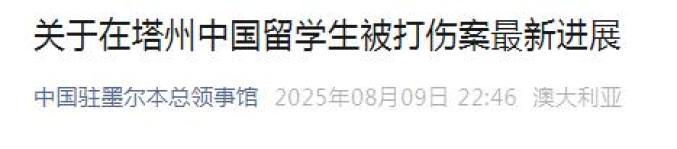 近日,一名33歲中國(guó)留學(xué)生被當(dāng)?shù)匚迕闯赡耆藲蛑轮貍歪t(yī)救治一事引發(fā)廣泛關(guān)注。8月9日晚,我駐墨爾本總領(lǐng)事館通報(bào)了在塔州中國(guó)留學(xué)生被打傷案的最新進(jìn)展:該學(xué)生已脫離生命危險(xiǎn),肇事者已被全部抓獲。具體情況如下: