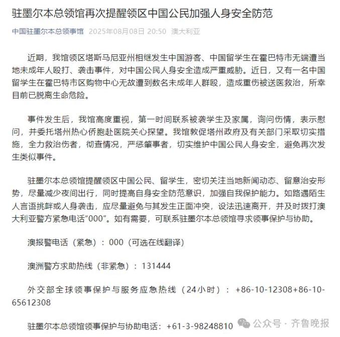 8月8日晚,“中國(guó)駐墨爾本總領(lǐng)事館”官微發(fā)文提醒領(lǐng)區(qū)中國(guó)公民加強(qiáng)人身安全防范:近期,我館領(lǐng)區(qū)塔斯馬尼亞州相繼發(fā)生中國(guó)游客、中國(guó)留學(xué)生在霍巴特市無(wú)端遭當(dāng)?shù)匚闯赡耆藲?、襲擊事件,對(duì)中國(guó)公民人身安全造成嚴(yán)重威脅。近日,又有一名中國(guó)留學(xué)生在霍巴特市區(qū)購(gòu)物中心無(wú)故遭到數(shù)名未成年人群毆,造成重傷被送醫(yī)救治,所幸目前已脫離生命危險(xiǎn)。