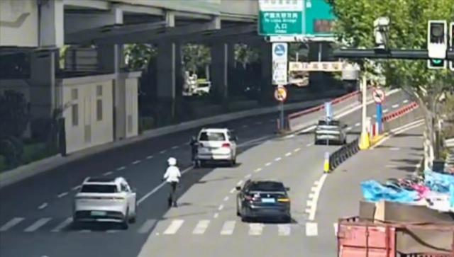 無獨有偶,同樣在高溫天,中山南二路宛平路口東南側(cè),一輛轎車拋錨停在了路中間。