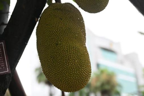 菠蘿蜜從最初的一果獨(dú)懸,到如今數(shù)果并秀,高高掛在行政樓前的枝頭,將周?chē)木爸卵b點(diǎn)得韻味十足,或?qū)庫(kù)o或悠然,自在安然。