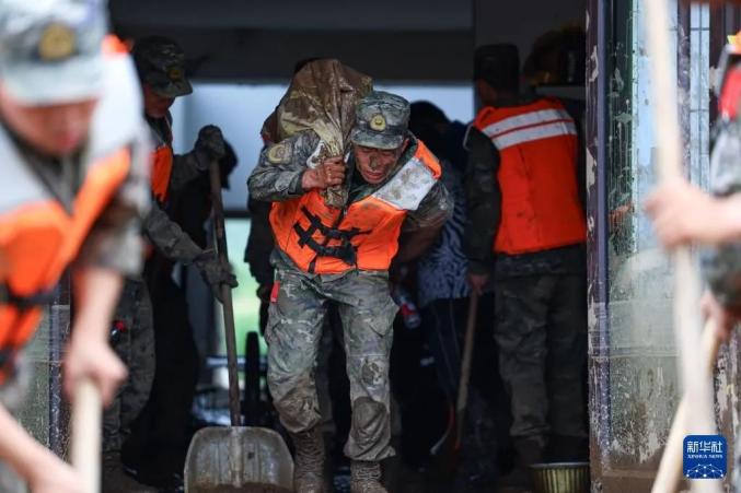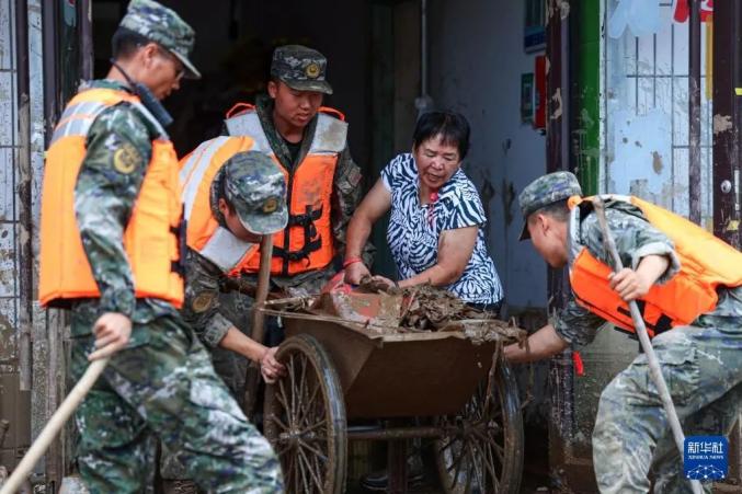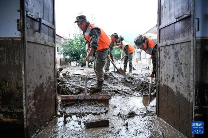 8月9日,武警甘肅總隊機動支隊官兵在蘭州市榆中縣城關鎮(zhèn)興隆山村清理雜物。新華社發(fā)(侯崇慧 攝)