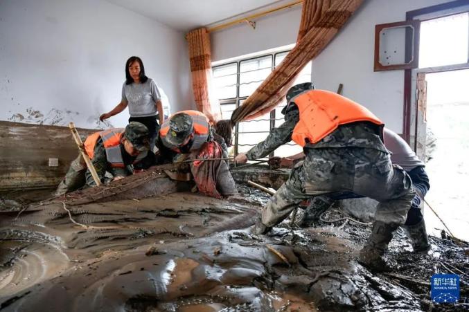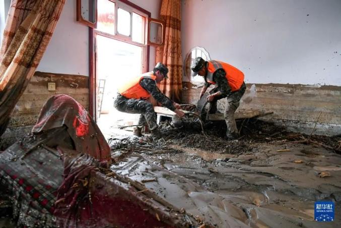 8月9日,武警甘肅總隊機動支隊官兵在蘭州市榆中縣城關鎮(zhèn)興隆山村受災村民房間內清理雜物。新華社發(fā)(侯崇慧 攝)
