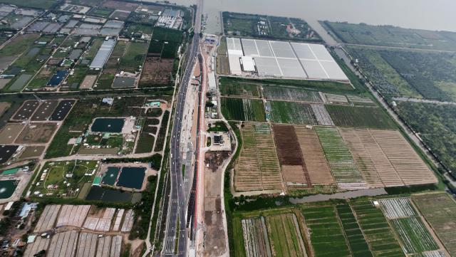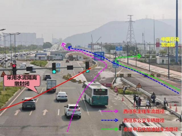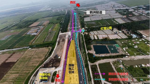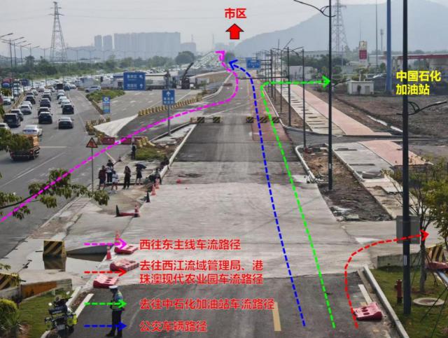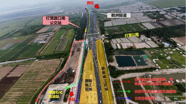 西往東方向公交車輛以及去往西江流域管理局、港珠澳現(xiàn)代農(nóng)業(yè)園、中石化加油站的車輛,需提前在鶴洲隧道西出口匝道駛?cè)胼o道,通過輔道達(dá)到目的地。