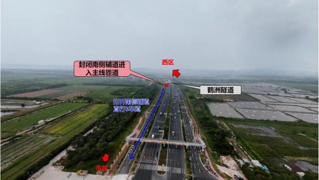 封閉鶴洲北隧道南側(cè)輔道進(jìn)入主線的匝道,打開輔道直行三車道,江珠路口至燈籠路口南側(cè)輔道維持三車道通行標(biāo)準(zhǔn),并按三車道規(guī)模匯入新建輔道。