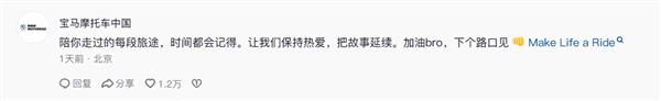 此事引發(fā)網(wǎng)友熱議,寶馬摩托車中國官方評論道:陪你走過的每段旅途,時間都會記得。讓我們保持熱愛,把故事延續(xù)。加油bro,下個路口見,Make Life a Ride。