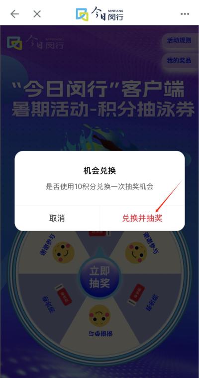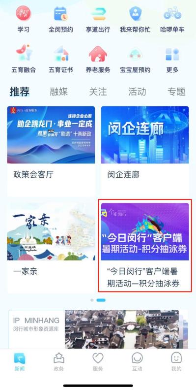 2. 在首頁(yè)找到“今日閔行”客戶端暑期活動(dòng)——積分抽泳券,然后點(diǎn)擊進(jìn)入