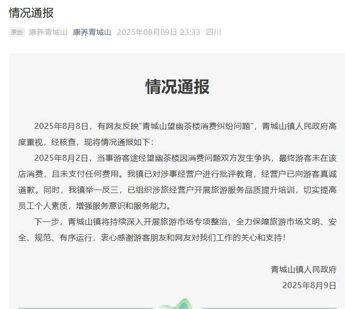 針對此事,8月9日晚間,青城山鎮(zhèn)人民政府發(fā)布《情況通報》,通報顯示,8月8日有網友反映“青城山望幽茶樓消費糾紛問題”,青城山鎮(zhèn)人民政府高度重視,經核查,現將情況通報如下: