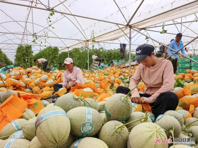 8月的金塔,戈壁灘上的日光溫室宛如一片片翡翠,鑲嵌在大漠邊緣。在金塔縣鼎新鎮(zhèn)的萬畝綠色標(biāo)準(zhǔn)化設(shè)施瓜菜產(chǎn)業(yè)園里,網(wǎng)紋密布的蜜瓜沉甸甸地從藤蔓上垂掛下來,飽滿得好似要撐破表皮。工人們戴著草帽在瓜田間忙碌穿梭,他們用指尖輕輕觸碰瓜皮,仔細(xì)辨別蜜瓜的成熟度。剪下的蜜瓜被迅速進(jìn)行分揀、套網(wǎng)、裝箱,叉車來回往返,將一箱箱滿載“甜蜜”的蜜瓜裝上貨車。曾經(jīng)被視為“不毛之地”的戈壁,此刻洋溢著豐收的喜悅。