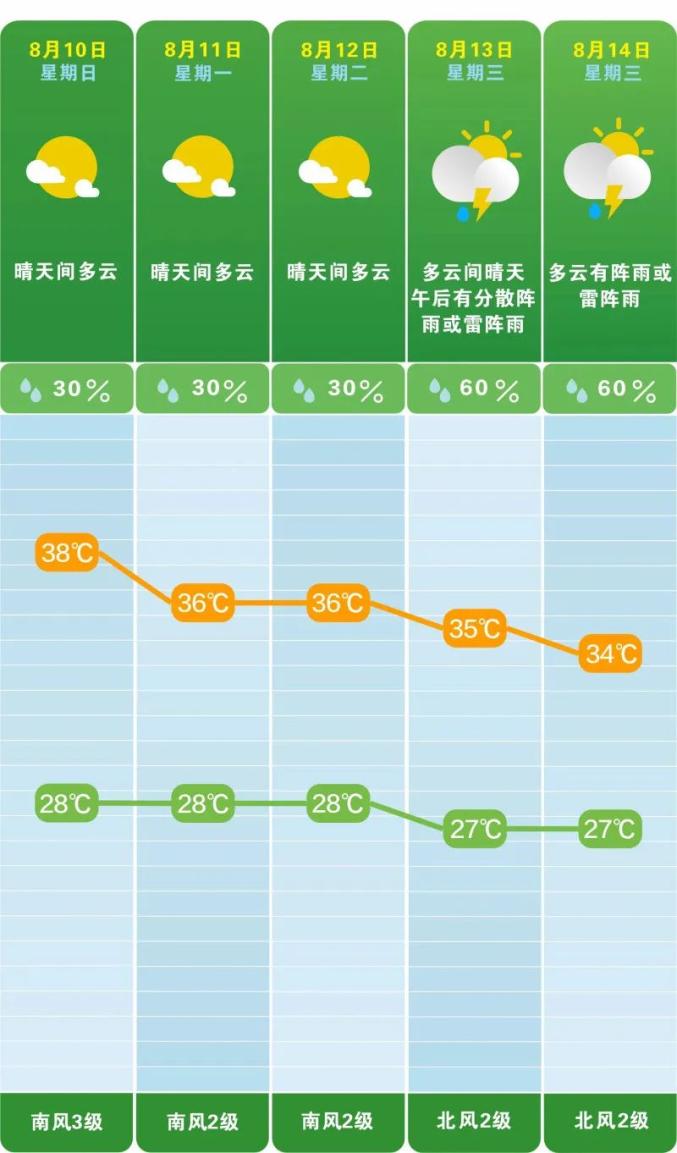 下面來(lái)看長(zhǎng)沙最新天氣預(yù)報(bào):10日,天氣為晴天或多云;11日到15日,晴天到多云,多午后陣雨或雷陣雨。其中,10日長(zhǎng)沙最高氣溫可達(dá)38℃,下周最高氣溫將下降至35℃左右。