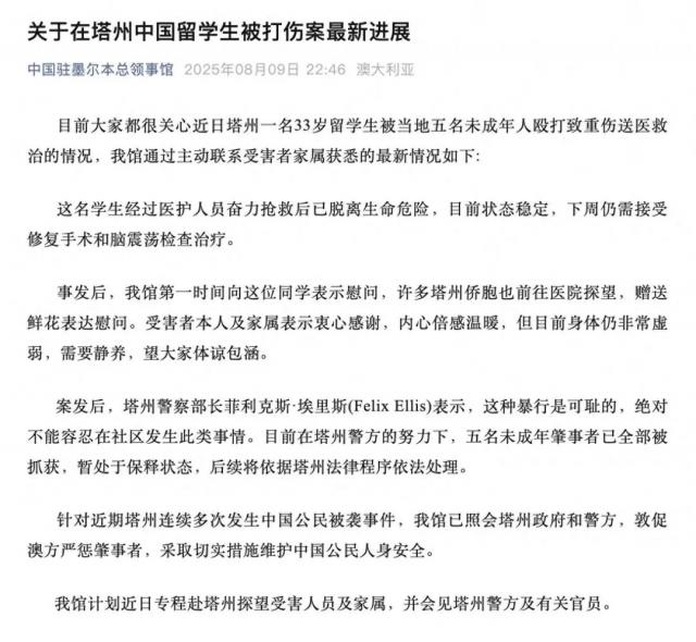8月8日晚,中國駐墨爾本總領(lǐng)事館發(fā)布消息,近日,一名中國留學(xué)生在塔斯馬尼亞州霍巴特市區(qū)購物中心無故遭到數(shù)名未成年人群毆,重傷后被送醫(yī)救治,所幸目前已脫離生命危險。