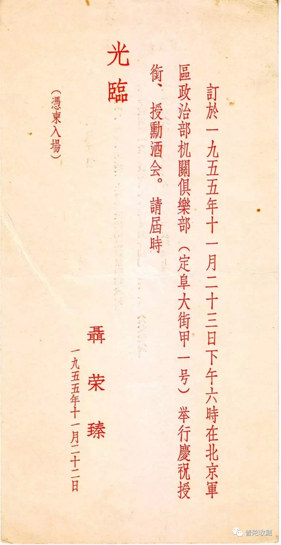 收藏可遇不可求,遇到好機(jī)會要努力爭取。有一次,聽說 1955 年聶榮臻元帥署名的授銜請柬出現(xiàn)在北京某收藏品市場,郭乃興興奮地從上海坐火車趕赴北京。找了 3 天沒找到,休息時,他在舊柜臺邊角發(fā)現(xiàn)了那張請柬,“就是我要找的!”他興奮地買下了它。