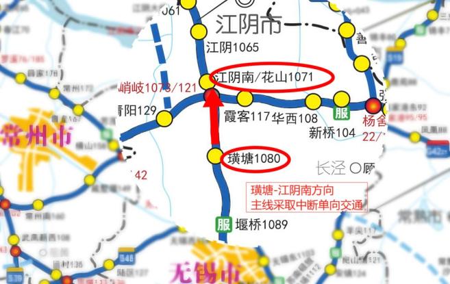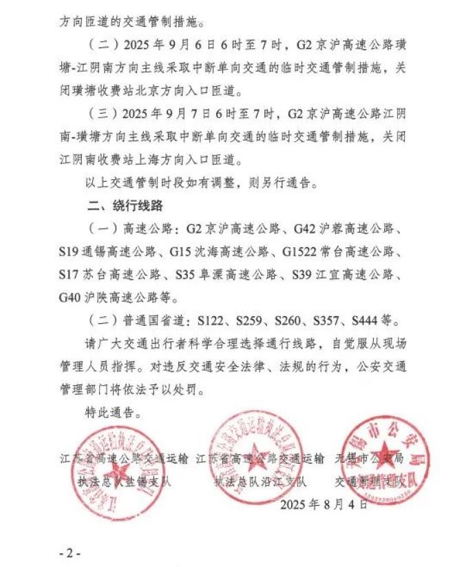 ( 三 )2025年9月7日6時(shí)至7時(shí),G2京滬高速公路江陰南 - 璜塘方向主線中斷單向交通,關(guān)閉江陰南收費(fèi)站上海方向入口匝道。