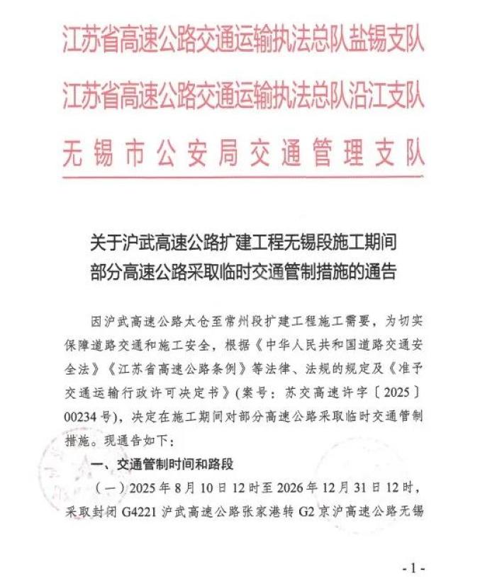 ( 一)2025年8月10日12時(shí)至2026年12月31日12時(shí),封閉G4221滬武高速公路張家港轉(zhuǎn)G2京滬高速公路無錫方向匝道。
