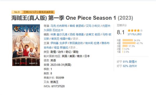 據(jù)悉,真人版《海賊王》第一季于2023年8月上線。開播兩周,該劇便蟬聯(lián)網(wǎng)飛劇集全球觀看人次榜冠軍;開播10天,累計觀看時長達(dá)到2.858億小時,累計觀看人次達(dá)3780萬人。