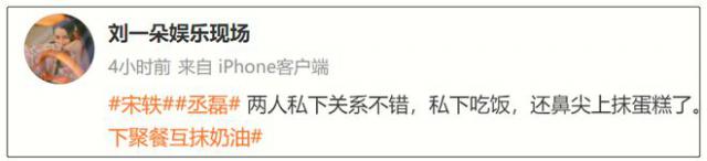 有網(wǎng)友質(zhì)疑宋軼和丞磊戀愛了,畢竟之前楊紫因“夜光蛋糕”事件被質(zhì)疑和劉學(xué)義戀愛,如今宋軼和丞磊公然互抹蛋糕,關(guān)系過于親昵。