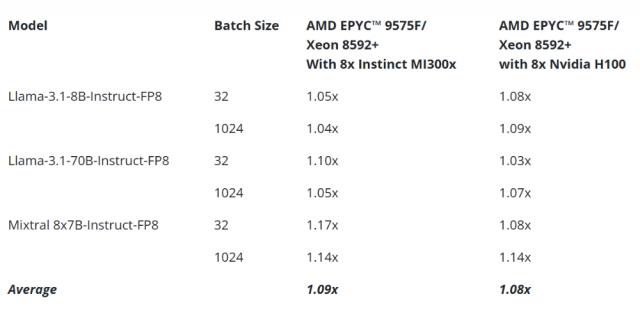 在Llama 3.1和Mixtral等AI模型上,基于AMD Instinct ? MI300 GPU的系統(tǒng)平均推理時(shí)間快9%。在Llama3.1和Mixtral等AI模型上,8個(gè)Nvidia H100 GPU系統(tǒng)平均推理時(shí)間快8%。