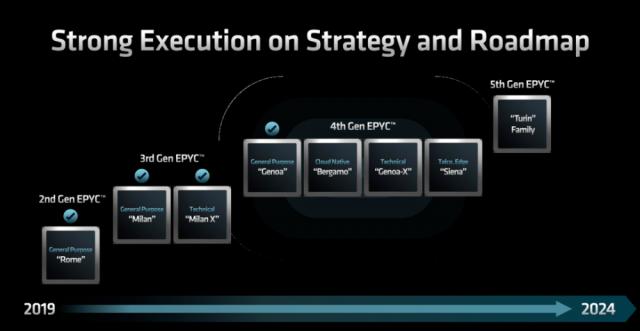 回顧AMD EPYC各代處理器的發(fā)展,它們都致力于為客戶(hù)提供高性能、低能耗的CPU。2017年,AMD推出基于Zen架構(gòu)的EPYC霄龍服務(wù)器處理器Naples,打破了英特爾在服務(wù)器市場(chǎng)的優(yōu)勢(shì),開(kāi)啟高性能計(jì)算領(lǐng)域的競(jìng)爭(zhēng)。2019年,基于Zen 2架構(gòu)的第二代霄龍Rome問(wèn)世,首次將7nm先進(jìn)制程引入數(shù)據(jù)中心。2021年,AMD發(fā)布采用Zen 3架構(gòu)的第三代EPYC霄龍服務(wù)器處理器Milan。后續(xù)還有第四代產(chǎn)品Genoa、Bergamo等,去年推出的第5代EPYC CPU Turin將核心數(shù)提升至192核。