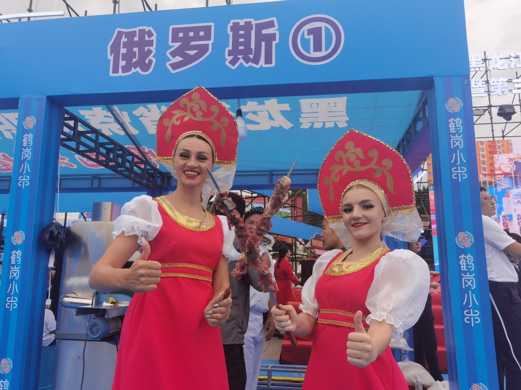 俄羅斯籍代表隊參與此次燒烤大賽,圖為兩名俄羅斯姑娘展示烤好的烤串。 鶴崗市委宣傳部 供圖