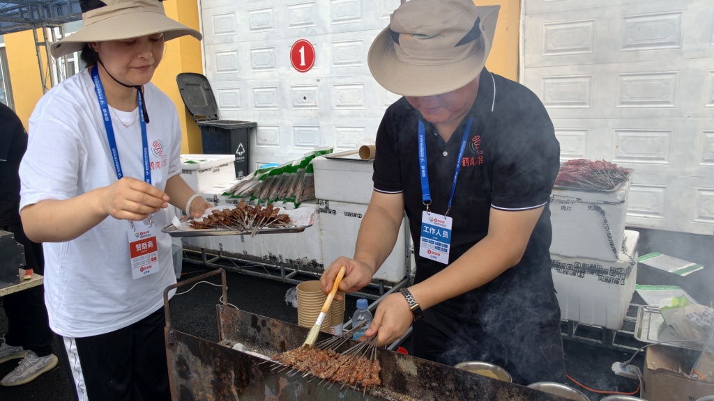 8月10日,2025年鶴崗森林半程馬拉松終點(diǎn),廚師正在為參賽選手制作鶴崗小串。 澎湃新聞?dòng)浾?鄭問 圖