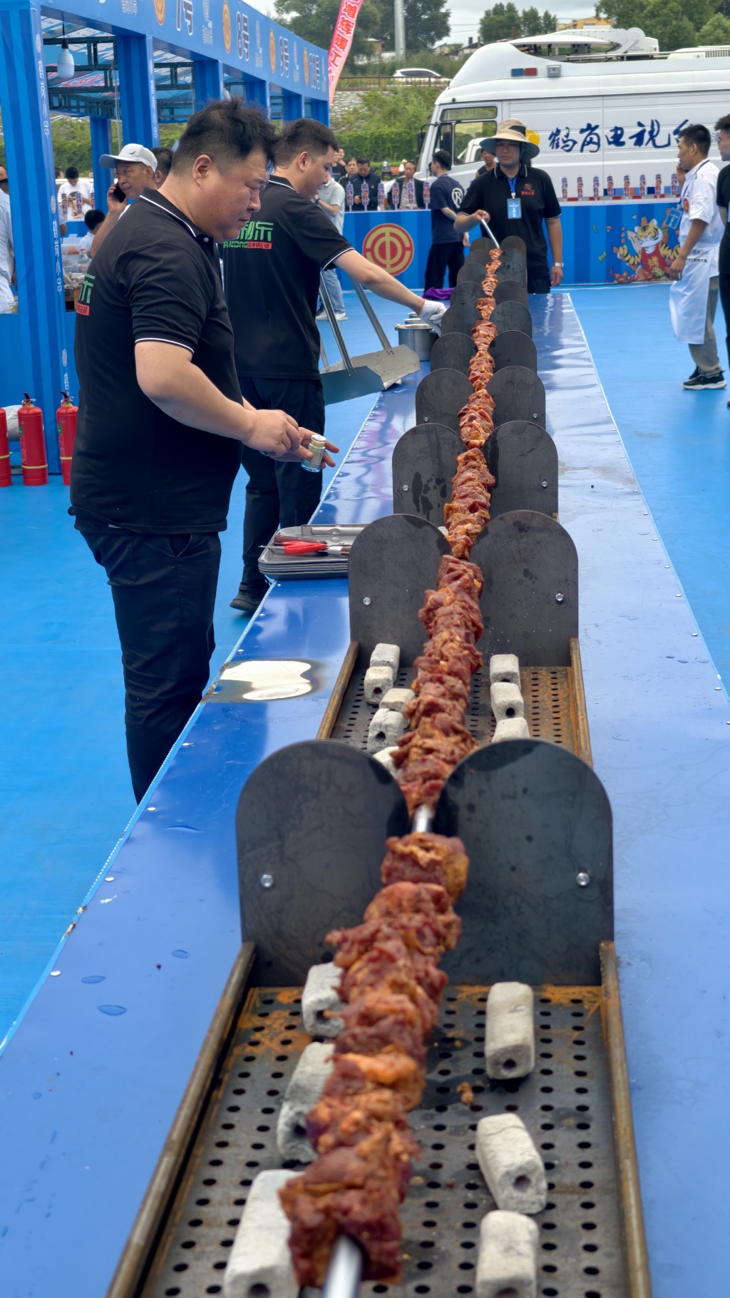 8月10日,2025年黑龍江省燒烤職工技能大賽上,參賽選手正在燒烤一串10米長的巨型鶴崗小串。 澎湃新聞?dòng)浾?鄭問 圖