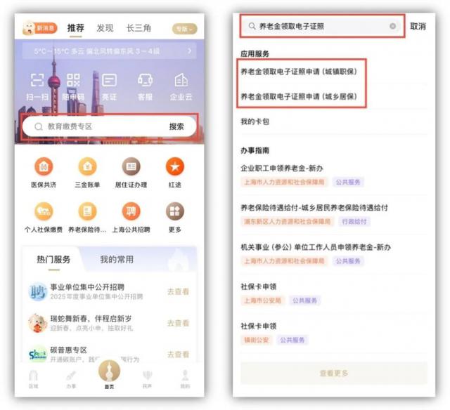 1. 登錄“隨申辦市民云”APP,點擊搜索欄并輸入“養(yǎng)老金領取電子證照申請”查詢,選擇“養(yǎng)老金領取電子證照申請(城鎮(zhèn)職保)”或“養(yǎng)老金領取電子證照申請(城鄉(xiāng)居保)”進入“養(yǎng)老金獲取電子證照”界面;