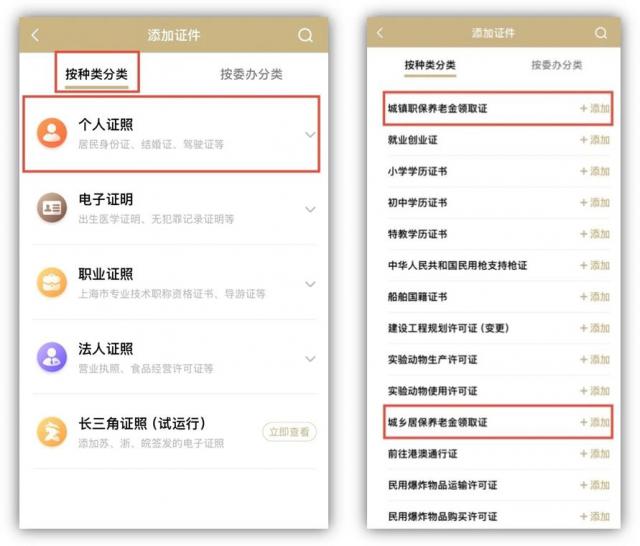 3. 點擊“個人證照”,查找“城鎮(zhèn)職保養(yǎng)老金領取證”或“城鄉(xiāng)居保養(yǎng)老金領取證”,點擊“添加”即可。