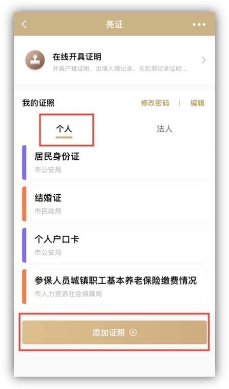 2. 在“亮證”界面選擇“個人”,點擊下方“添加證照”;