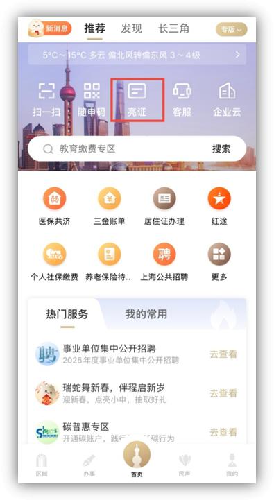 1. 登錄“隨申辦市民云”APP,點擊“亮證”;