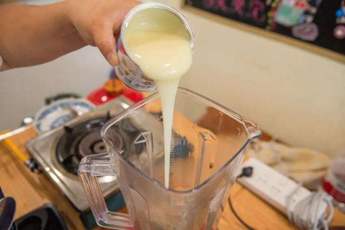 6. 加入適量的純凈水與煉乳,攪拌2分鐘。