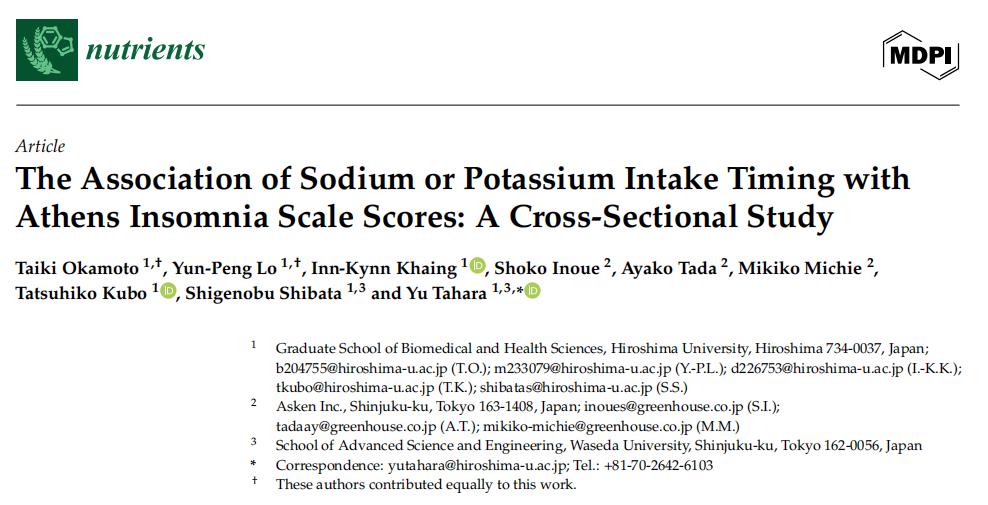 ①Okamoto T , Lo Y P , Khaing I K ,et al.The Association of Sodium or Potassium Intake Timing with Athens Insomnia Scale Scores: A Cross-Sectional Study[J].Nutrients, 2024, 17.DOI:10.3390/nu17010148.