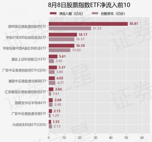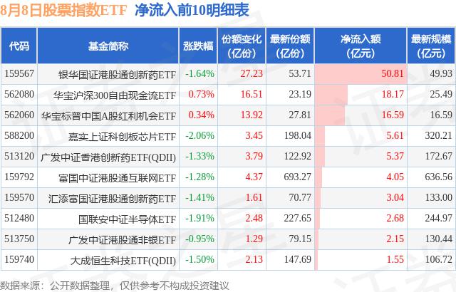 當日有265只股票指數(shù)ETF基金出現(xiàn)資金凈流入,其中凈流入排首位的是銀華國證港股通創(chuàng)新藥ETF(159567),份額增加了27.23億份,凈流入額為50.81億元。
