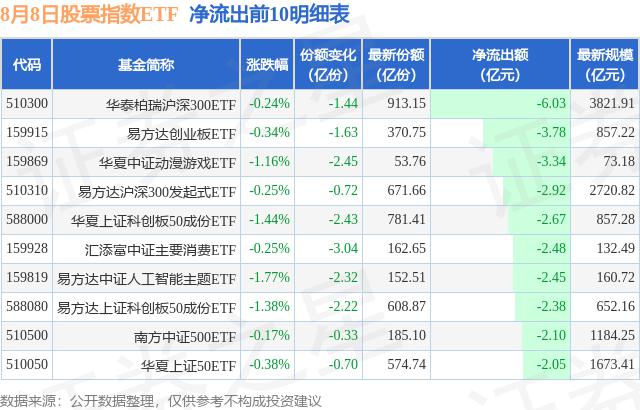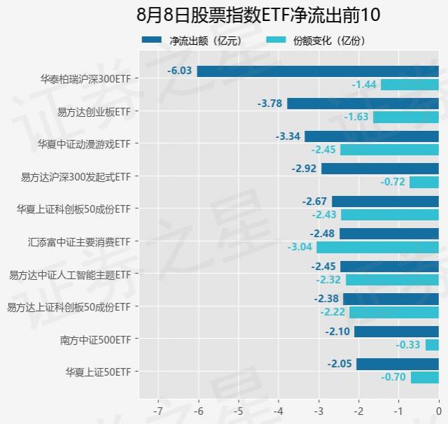 當日有367只股票指數(shù)ETF基金出現(xiàn)資金凈流出,其中凈流出排首位的是華泰柏瑞滬深300ETF(510300),份額減少了1.44億份,凈流出額為6.03億元。