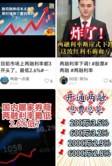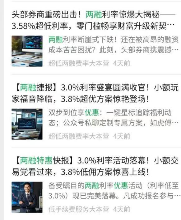 每當(dāng)市場(chǎng)對(duì)兩融預(yù)期向好時(shí),就會(huì)出現(xiàn)券商下調(diào)兩融利率的傳言。近期,網(wǎng)絡(luò)平臺(tái)上出現(xiàn)了很多通過低融資利率招攬客戶的帖子,像“3.58%超低利率,零門檻暢享”“頭部券商,兩融利率最低可到3%”“兩融利率斷崖式下跌”等宣傳語十分吸引眼球。