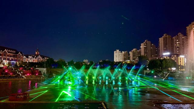 夜幕降臨,燈光漸暗。19時30分,音樂響起,激昂旋律瞬間點燃現(xiàn)場氣氛。剎那間,噴泉與燈光秀仿佛被施了魔法,隨音樂舞動起來。