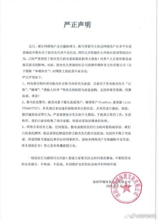 10日,深圳華璨體育文化有限公司發(fā)布聲明:近期,部分網(wǎng)絡(luò)用戶、自媒體博主、賬號營銷號主體以及其他網(wǎng)絡(luò)用戶,在多個平臺惡意編造并散布關(guān)于徐杰先生的不實信息,通過利用公共資源在公共場合造謠等違法行為,嚴(yán)重侵犯了徐杰先生的名譽(yù)權(quán)、隱私權(quán)等人格權(quán),給他的個人名譽(yù)和形象造成了極其惡劣的影響。對此,徐杰先生所屬的經(jīng)紀(jì)公司深圳華璨體育文化有限公司(以下簡稱“華璨體育”),針對網(wǎng)絡(luò)上的此類不實言論,嚴(yán)正聲明如下:
