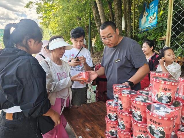 慶典高潮時,工作人員為現(xiàn)場的小朋友們分發(fā)了特制的思嘉“生日蛋糕”,大家一同共享甜蜜時刻。熊貓館還為所有到場的游客朋友們準(zhǔn)備了一份特別禮物——印有思嘉及其伙伴佑佑可愛卡通形象的定制酸辣粉,讓歡樂與美味一同傳遞。