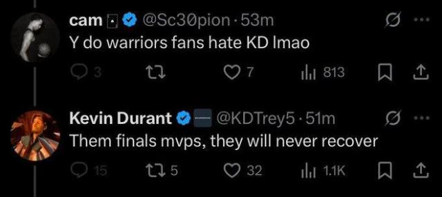 網(wǎng)友A表示:“勇士球迷真的恨KD啊,哈哈。”