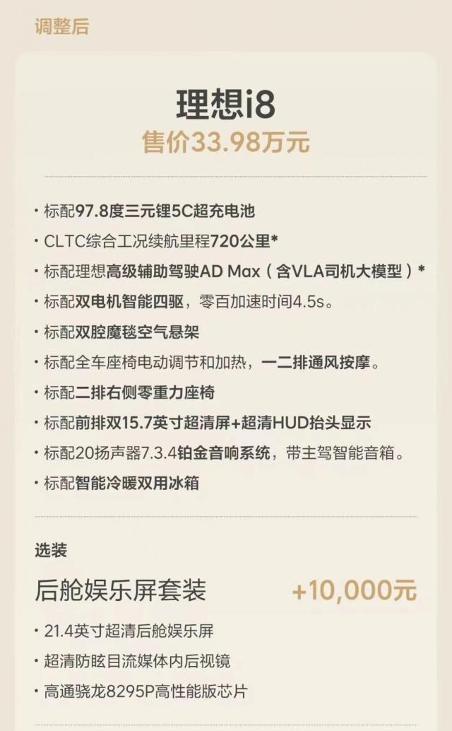 上周,理想官方正式宣布調(diào)整 i8 的 SKU。取消多版本配置,統(tǒng)一為 Max 版本,將用戶呼聲高的“冰箱、彩電、大沙發(fā)”全面標(biāo)配,同時(shí)降價(jià)至 33.98 萬元。一場知錯(cuò)就改的補(bǔ)救行動(dòng)迅速展開。