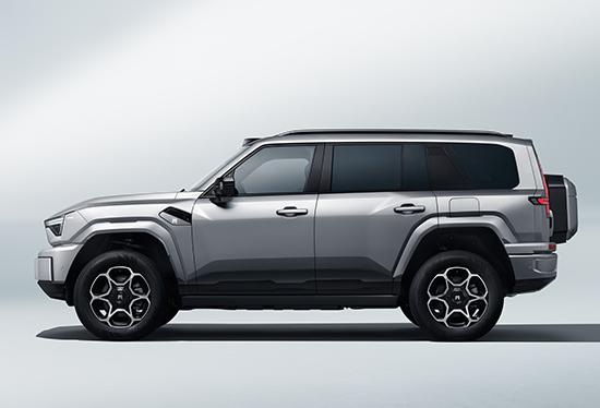 車身側(cè)面,新車展現(xiàn)出魁梧的體量感。剛勁有力的肌肉線條貫穿整個(gè)車身,搭配高聳的輪拱,營(yíng)造出強(qiáng)烈的視覺(jué)沖擊和越野姿態(tài)。