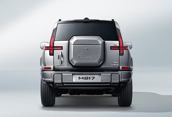 猛士 M817 的外觀采用了品牌標(biāo)志性的“雄魂美學(xué) 2.0 ”設(shè)計(jì)語(yǔ)言,展現(xiàn)出極具視覺(jué)沖擊力的硬派風(fēng)格。其前臉極具辨識(shí)度,窄條幅的梯形進(jìn)氣格柵氣勢(shì)不凡,與兩側(cè)銳利的多邊形 LED 大燈組緊密相連,共同塑造出車頭的力量感。前杠下方安裝了堅(jiān)固的銀色金屬護(hù)板,不但提升了防護(hù)性能,可應(yīng)對(duì)復(fù)雜路況下的磕碰刮擦,而且其接近角高達(dá) 30 °,為出色的通過(guò)性提供了保障。