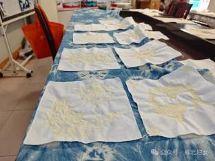 第一節(jié)課教授扎染。扎染工藝包括扎結(jié)和染色兩部分,通過紗、線、繩等工具,對織物進(jìn)行扎、縫、縛、綴、夾等多種形式組合后再染色。